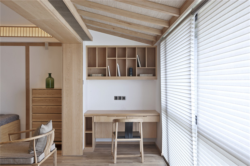 閑置的墻角位置活用為書房,內(nèi)嵌式的設計進一步地節(jié)省空間,木質的書架和書桌簡單又實用,緊扣家居風格。