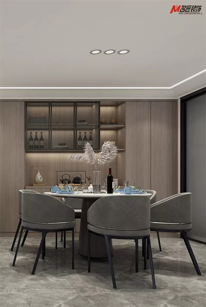 客餐廳互為一體的融合關(guān)系,最大限度地利用了光源,在轉(zhuǎn)瞬即逝的光影變化中體驗(yàn)材料的細(xì)節(jié)之處。原木紋墻柜、大理石餐桌、時(shí)尚餐椅、簡約風(fēng)射燈,舒適的令人對每日三餐充滿向往和期待。