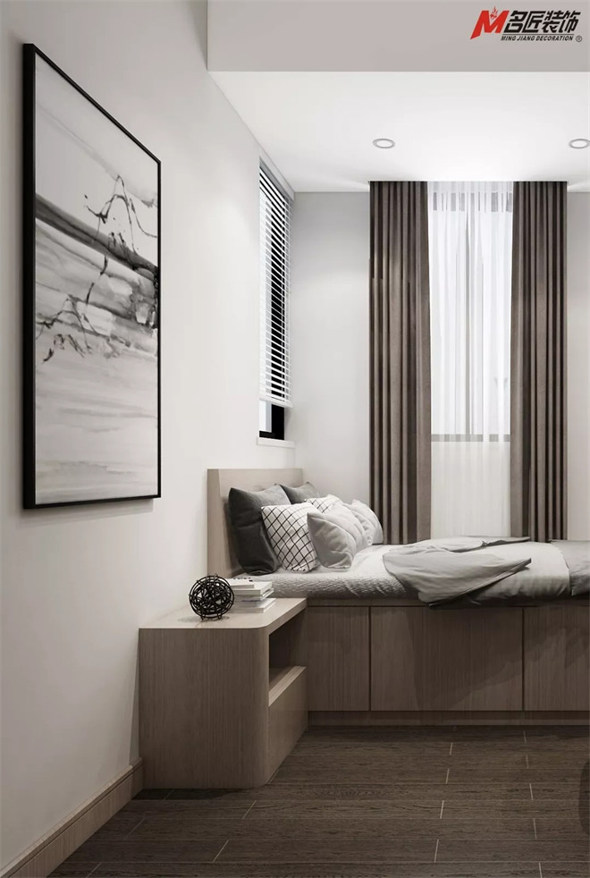 在公共空間的儒雅之外,設(shè)計(jì)師將濃重的筆墨留在了臥室。木飾紋面、精致的擺件,以和諧的比例出現(xiàn)在各處,淺灰雙人床、精美的邊柜、實(shí)用的衣櫥和床頭柜,無不展現(xiàn)出對細(xì)節(jié)的恰到好處。點(diǎn)睛之筆的壁畫和床頭燈飾呼應(yīng)了江南風(fēng)的小資情調(diào),滿懷青春的浪漫溫馨。