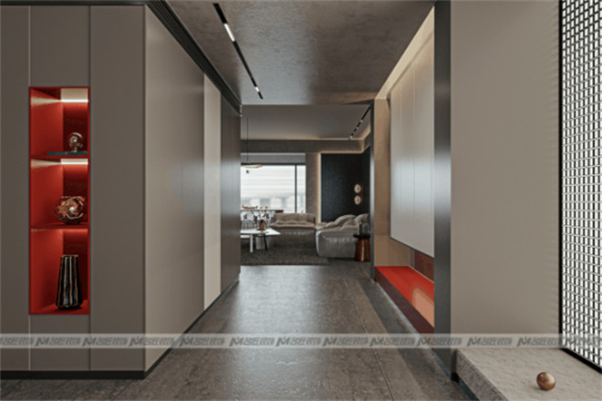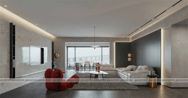 客廳與觀景陽臺相連,大面積的長虹紋玻璃墻,帶來良好的采光,延伸視覺效果,擴大空間感。再添入一抹朱紅,驚艷了時光。