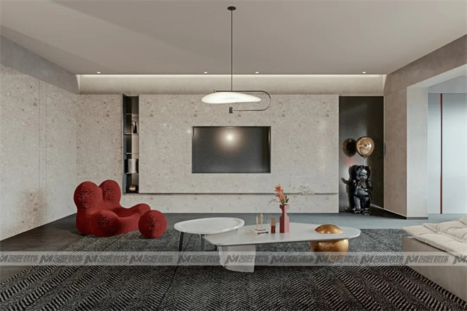 整個客廳充斥著高級而又格調(diào)的氛圍感,無主燈設(shè)計,將燈帶、磁軌燈、壁燈等進行組合,兼顧墻、頂、地三面的照明訴求。電視背景墻是一面水磨石墻,其自然豐富的肌理紋路與空間里的其他色塊不謀而合,締造出一種低調(diào)細膩的美感,豐富感官體驗。沙發(fā)背景墻選擇了啞光烤漆板,設(shè)有隱藏式燈帶,緩緩漸變的輕柔光暈,中和了高級灰烤漆板的冰冷,精致的圓形壁燈加以點綴,減少墻面的單調(diào)。