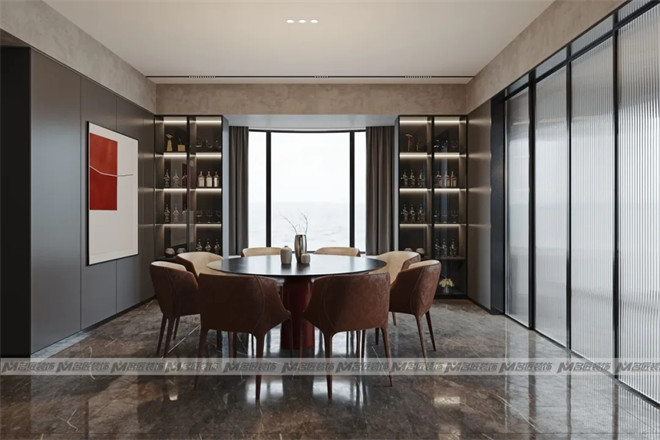 餐廳延續(xù)了客廳的無主燈設(shè)計,柜子藏光的設(shè)計,不僅起到裝飾作用,也突出空間的物品陳列。色彩分明的裝飾畫,瞬間提升居室格調(diào)。