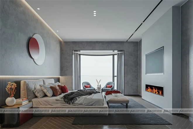 主臥以高級灰作為肌底,純粹內(nèi)斂的質(zhì)感給予人情緒上的安撫,注入紅色軟裝,出現(xiàn)在裝飾畫、抱枕、床頭柜上,將張揚與低調(diào)銜接和諧,凸顯優(yōu)雅格調(diào)。