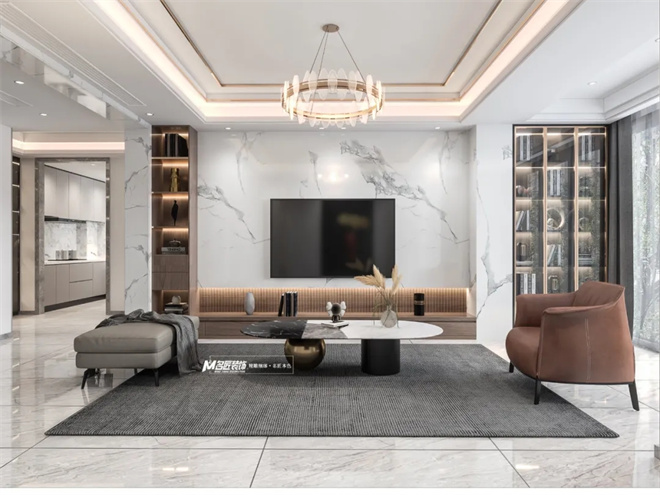 以輕奢為設(shè)計理念的貫穿與整個空間。對自然藝術(shù)品位有極高的要求為出發(fā)點,將現(xiàn)代簡約的設(shè)計與時尚格調(diào)相融合,作為家庭日常生活主要活動的共有空間,