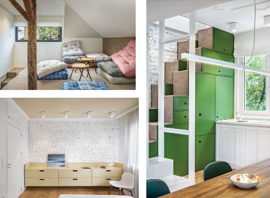 這是一間位于保加利亞的公寓,從結(jié)構(gòu)、模式甚至是顏色來看,這間公寓似乎比較單調(diào),很難找到出彩之處??蛷d里,最搶眼的也只不過是一張青綠色的普通沙發(fā),還有一"盞"頗具創(chuàng)意的吊燈。整個(gè)空間色調(diào)都是綠自搭配,綠色給人清新舒暢的感覺,而白色則像純真潔凈的微笑那般干凈。其實(shí),公寓是一個(gè)開放性的大房間,沒有門或者隔板,卻把每個(gè)空間都劃分完整;綠色的閣樓樓梯,看似是—個(gè)個(gè)收納柜,但設(shè)計(jì)師把廚房的電器都藏在樓梯柜里,省略了空間位置,又美觀實(shí)用;更隱秘的是,在卡其色書柜的后面是一個(gè)書房,而白色書柜后面則是一個(gè)單獨(dú)的臥室??臻g簡而不單,打破常規(guī)設(shè)計(jì),結(jié)合空間的地理特點(diǎn),給平凡的生活制造點(diǎn)驚喜。