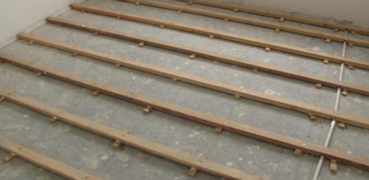 7.5、地板:地垅必須現(xiàn)沖,間距為中對中24.4厘米(無夾板墊底的除外),實用地板鋪設(shè)的,必須用地板釘在松木龍骨上固定。