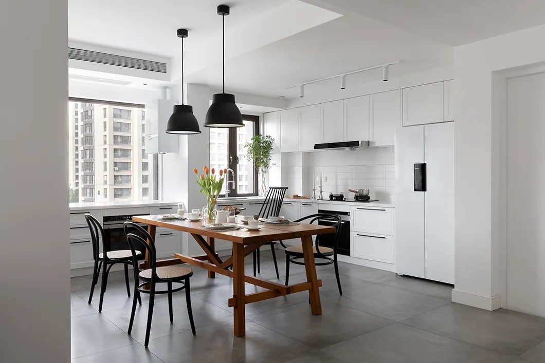 室內(nèi)餐廳裝修案例,餐廚空間其實(shí)和客廳空間沒(méi)有區(qū)分的那么明顯,好似一個(gè)整體。