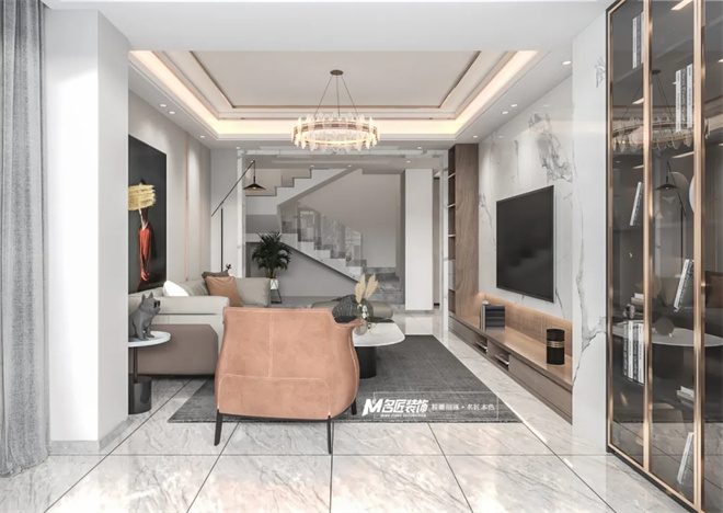 以輕奢為設(shè)計理念的貫穿與整個空間。對自然藝術(shù)品位有極高的要求為出發(fā)點,將現(xiàn)代簡約的設(shè)計與時尚格調(diào)相融合,作為家庭日常生活主要活動的共有空間,